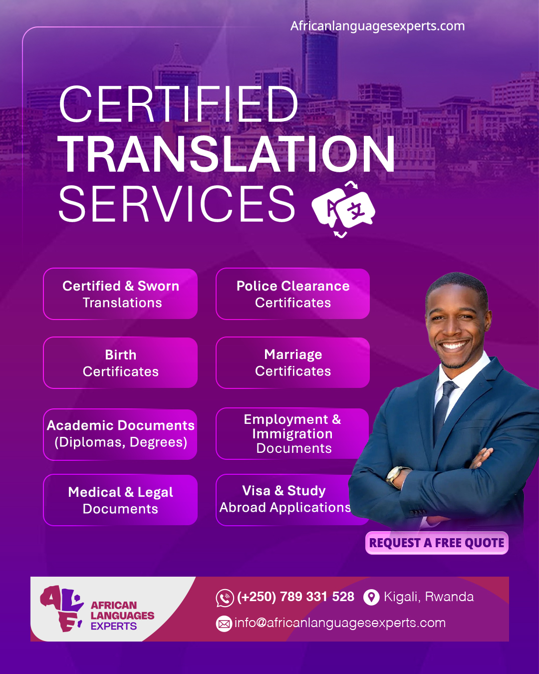 As a language solutions collaborator founded on meticulous processes and linguistic mastery, ALE stands out as a leading African provider of inventive translation, localization, and interpreting services. Nestled in the heart of Africa, in Rwanda, we have earned the trust of numerous regulated and non-regulated businesses.