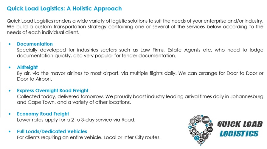 Quick Load Logistics renders a wide variety of logistic solutions to suit the needs of your enterprise and/or industry. We build a custom transportation strategy containing one or several of the services below according to the needs of each individual client.